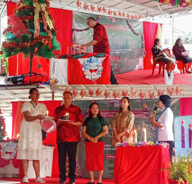 MANADO, Onesiaa.com – Suka cita dan hamoni terpancar dalam Ibadah Natal 2025 yang dilaksanakan oleh, Pemerintah Kecamatan Tuminting sekaligus dirangkaikan dengan Hari Ulang Tahun (HUT) Camat Tuminting, Hence Pantimbano yang bertempat di Kantor Kecamatan Tuminting, Jumat (12/12/2025).
