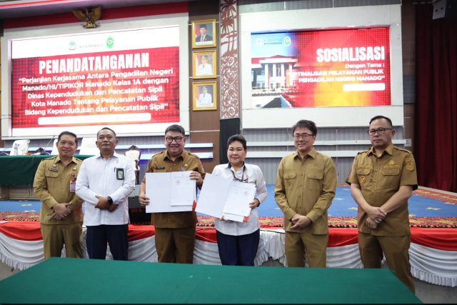 MANADO, Onesiaa.com – Guna mengoptimalkan pelayanan terbaik bagi masyarakat, Pemerintah Kota (Pemkot) Manado menggandeng Pengadilan Negeri (PN) Manado melakukan penandatanganan kerjasama penyelenggaraan pelayanan publik, bersama Dinas Kependudukan dan Pencatatan Sipil (Disdukcapil) Kota Manado, yang digelar di Aula Serbaguna Kantor Walikota Manado, Senin (9/3/2026).